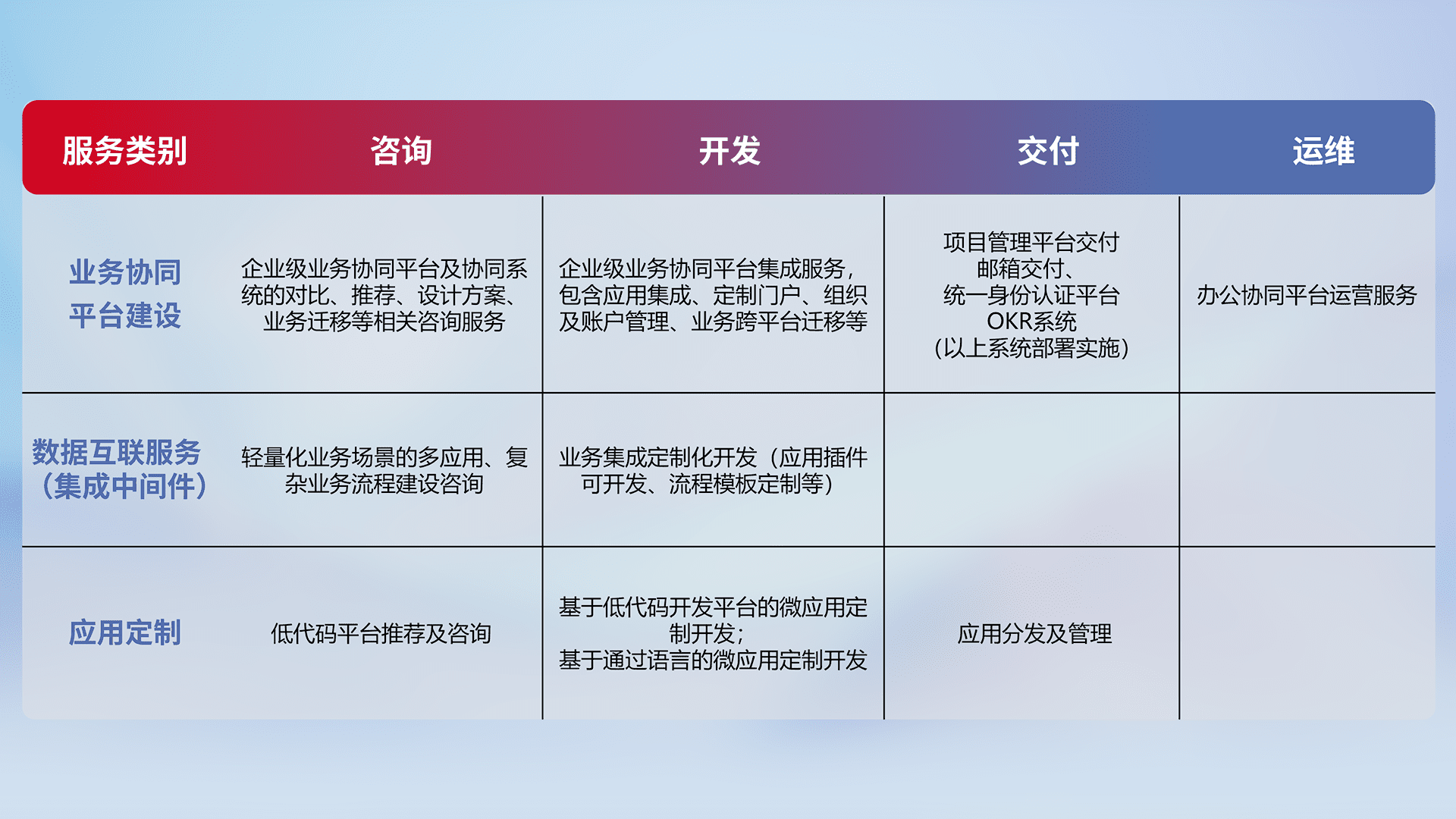 针对钉钉、、、企微、、IDaas等平台级产品提供产品的规划、、、方案、、、交付、、定制化开发等服务,,,,实现如统一协同办公、、智能客户服务、、混合会议管理、、、、智能数据查询、、等业务场景,,,实现数字化转型。。